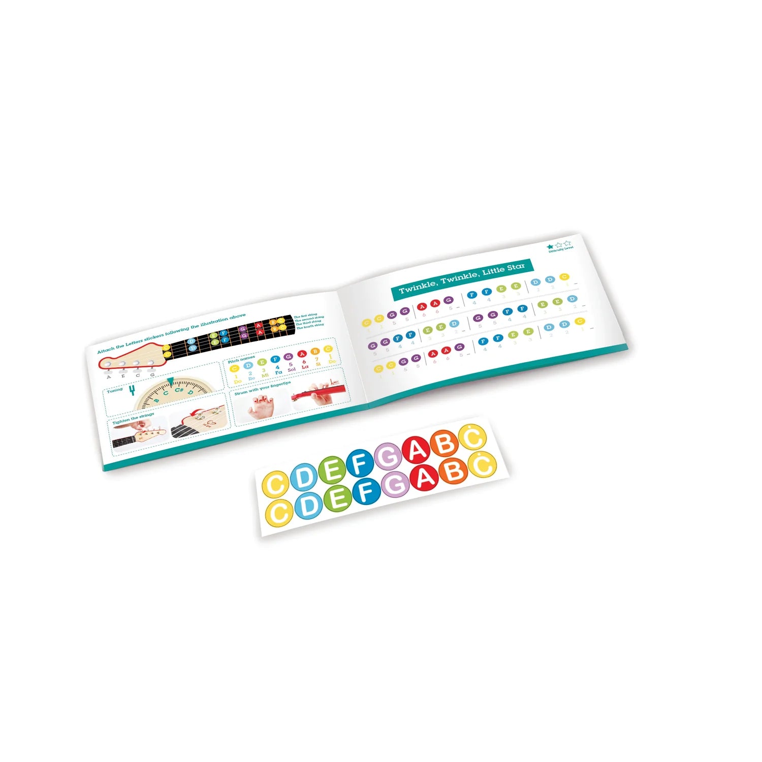 ستحصل على يوكليلي ملون وقابل للضبط بأوتار نايلون، ومقبض، وملصقات نوتات ملونة، وكتيب موسيقى. يعمل بثلاث بطاريات AA (عادةً ما تكون مرفقة)، وأحيانًا ببطارية صغيرة للإلكترونيات.